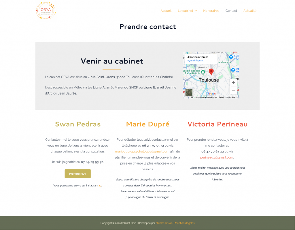 Le cabinet Orya regroupe trois professionnelles de santé aux spécialités complémentaires. L’enjeu de ce projet : concevoir un site capable de refléter à la fois l’unité du cabinet et l’identité propre à chaque praticienne.